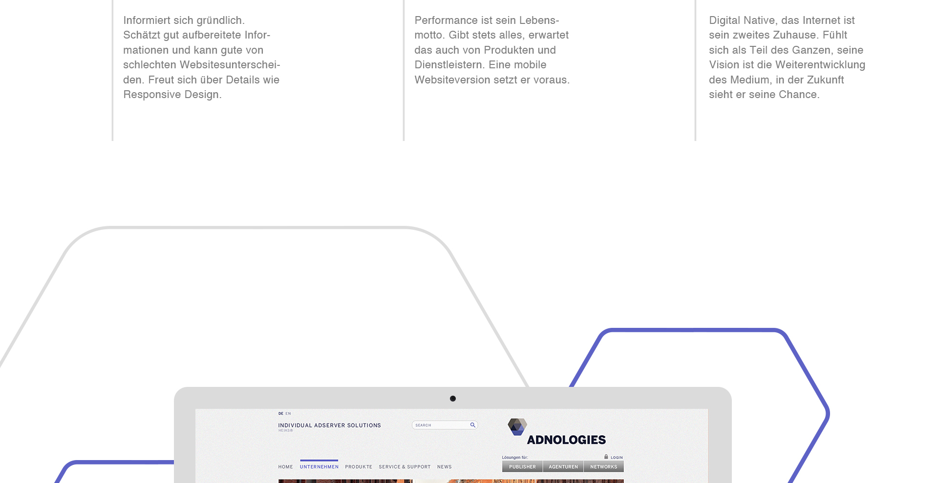 Mit dem Fokus auf die Nutzersegmente und ihre Bedürfnisse entwickelten wir ein Website-Konzept für Portalbetreiber, Agenturbesitzer oder digital Natives. Jede Einzelner soll über ein eigene Bereich abgeholt werden. Spezielle Kollagen und Illustrationen wurden besondern angefertigt die die Bedürfnisse und Umgebung der Zielgruppen darstellten.