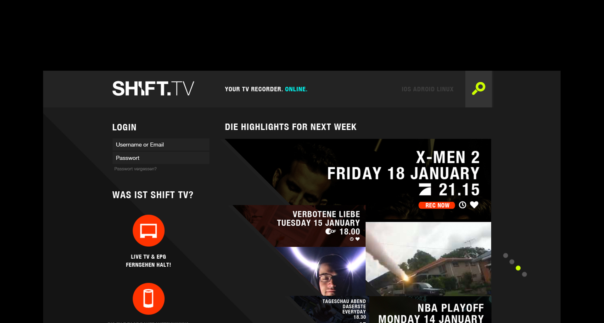 In einem gemeinsamen Workshop wurden der Markenkern, Nutzerbedürfnisse und Ziele des Services definiert und daraus ein eigenständiges Branding abgeleitet. SHIFT TV soll neue Zielgruppen erschließen und durch das Versprechen: „Verpasse nichts“ durch 7 Tage „Record-All-Funktion“ Freiheit und Unabhängigkeit vermitteln. Sanmiguel konzipierte in erste Linie an Hand von Wireframes den Aufbau der Webseite und später das User Interface des EPGs (Electronic Program Guide).